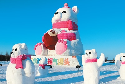 撫遠(yuǎn)市濱江公園里的“莓莓熊”雪雕,吸引不少外地游客前來“打卡”。