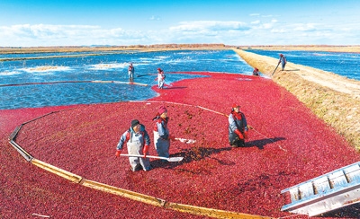 在撫遠(yuǎn)蔓越莓種植基地,工人正在收獲成熟的蔓越莓。