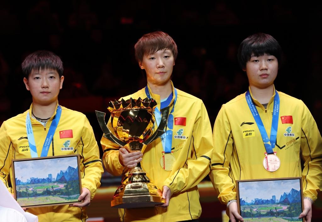 2月23日,冠軍王曼昱(中)、亞軍孫穎莎(左)和季軍蒯曼在頒獎(jiǎng)儀式上合影。新華社記者 盧漢欣 攝