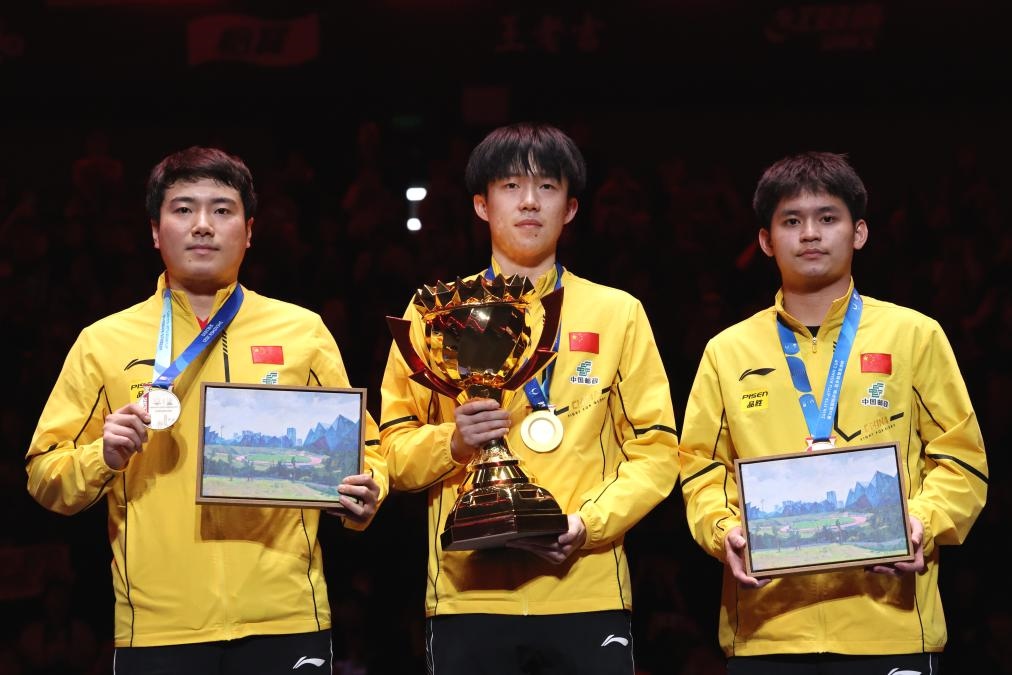 2月23日,冠軍王楚欽(中)、亞軍梁靖崑(左)和季軍林詩棟在頒獎(jiǎng)儀式上合影。新華社記者 梁旭 攝