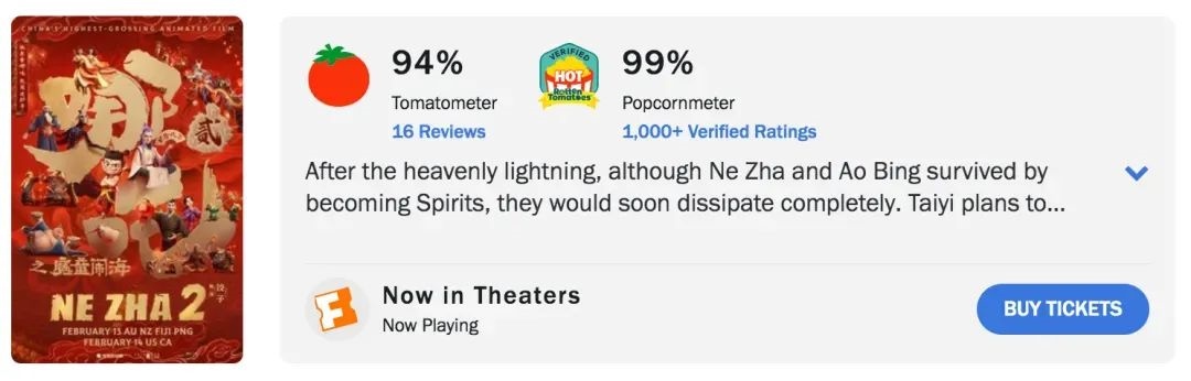 不僅打破了多項(xiàng)票房紀(jì)錄,《哪吒2》更以IMDb評(píng)分8.2分、爛番茄新鮮度94%、爆米花指數(shù)99%的口碑,讓世界看見中國(guó)電影的工業(yè)實(shí)力與文化魅力。