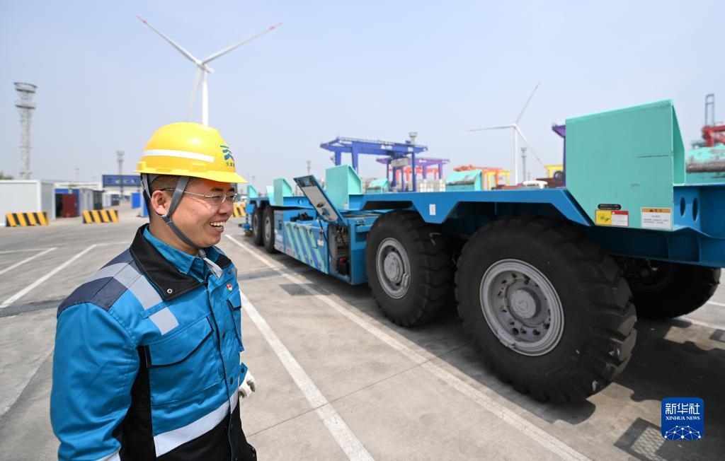 在天津港北疆港區(qū)C段智能化集裝箱碼頭,全國勞動(dòng)模范成衛(wèi)東參觀“水平運(yùn)輸機(jī)器人”(4月29日攝)。新華社記者 李然 攝